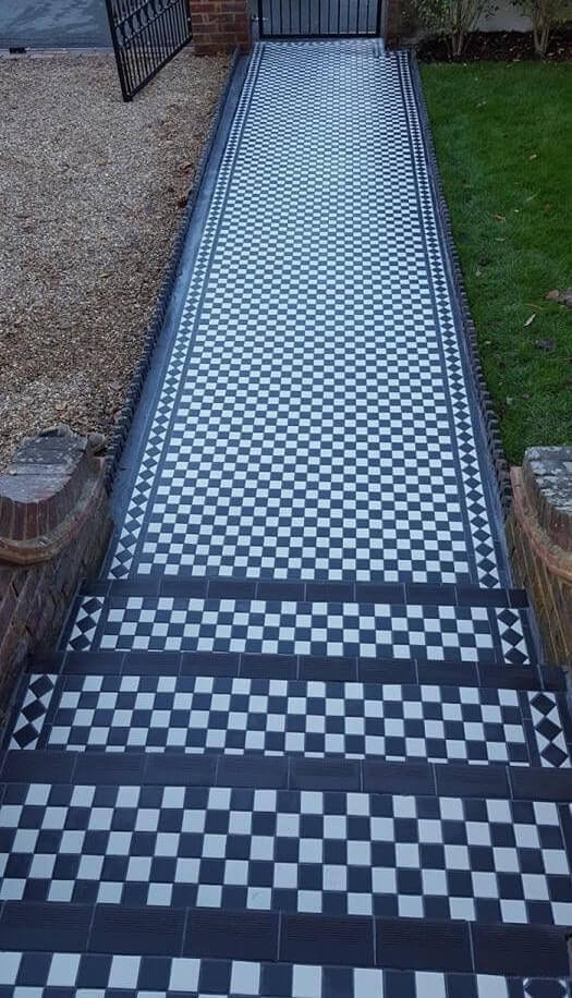 - A tiled path is more practical than a paved pathway, as it can be easier to clean